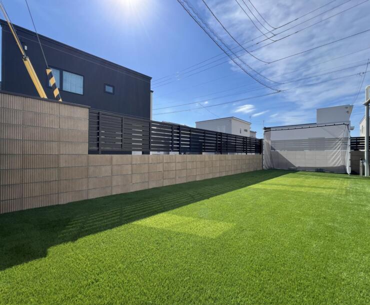 ランダムデザインに人工芝の緑が映えるナチュラルガーデン