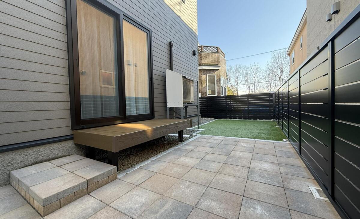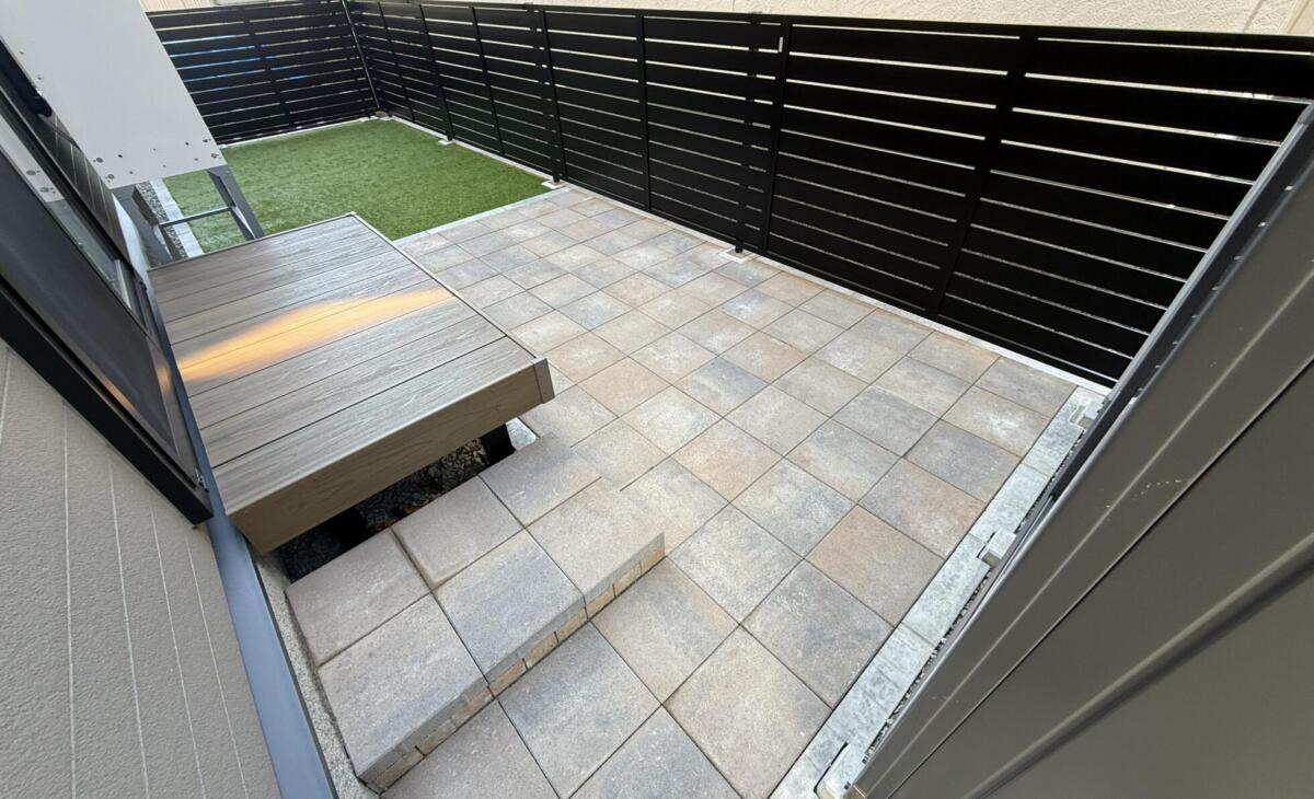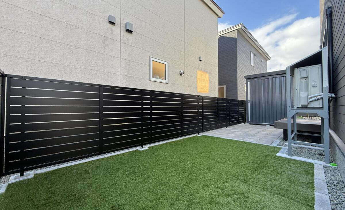 • ブラックカラーのスタイリッシュな目隠しフェンスで囲いプライベートと美観アップ、人工芝とインターロッキングでBBQ等色々活用出来るお庭になりました。物置を敷地の奥に配置した事で敷地を余すところなく有効活用。