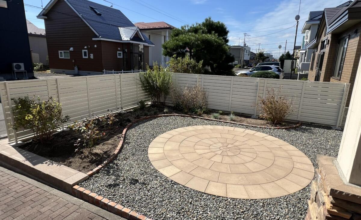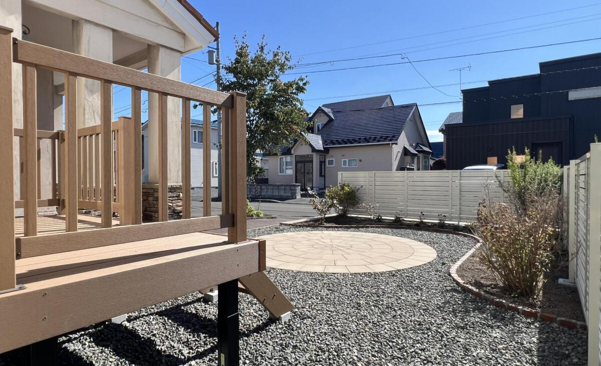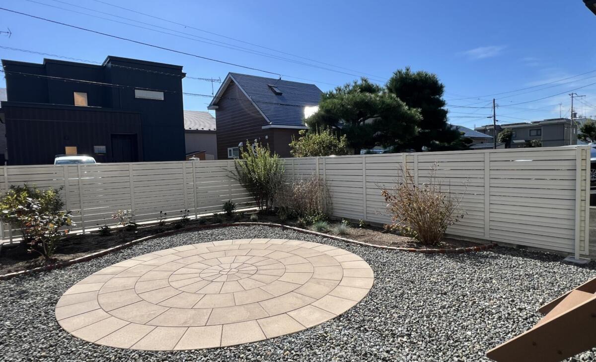 サークルストーンでお庭にアクセント 洋風 ガーデン 外構エクステリア 直径3mのサークルストーンを設置。テーブルや椅子等をおけるサイズ。イエローカラーで暖かいイメージに。人工木材ウッドデッキでローメンテナンス。 道路との高低差があるので土留石垣を設置しお庭はフラットに使いやすく 花壇ブロックはレンガ小端立で曲線に仕切りお洒落な花壇スペースに。 人工木ウッドデッキから降りると曲線が美しいお庭があり、植物が更にお庭を引き立ててくれます。 清潔感があり暖かみがあるホワイトカラーのアルミフェンスで仕切りをつけて明るいお庭に。 POINT ナチュラルな印象の洋風ガーデンにサークルストーンでアクセント。高さのあるウッドデッキはデッキフェンスで安全に。 外構エクステリア ガーデン カーヤード ライティング・その他 店舗・商業施設 洋風 一覧へ > ガーデン 一覧へ > 外構エクステリア 一覧へ >